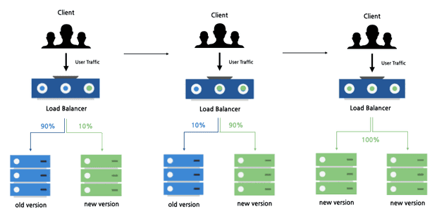 이전 버전 서버와 새로운 버전 서버를 두고, 공통 로드 밸런서를 통해 새로운 버전을 배포하는 전략이다.